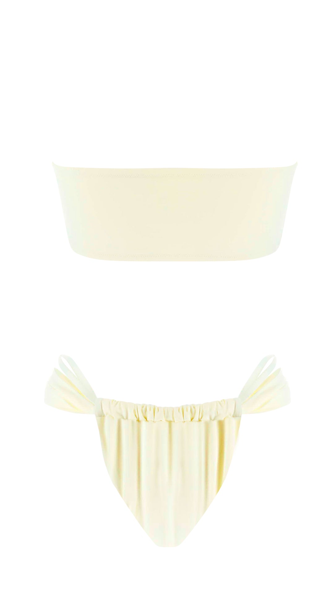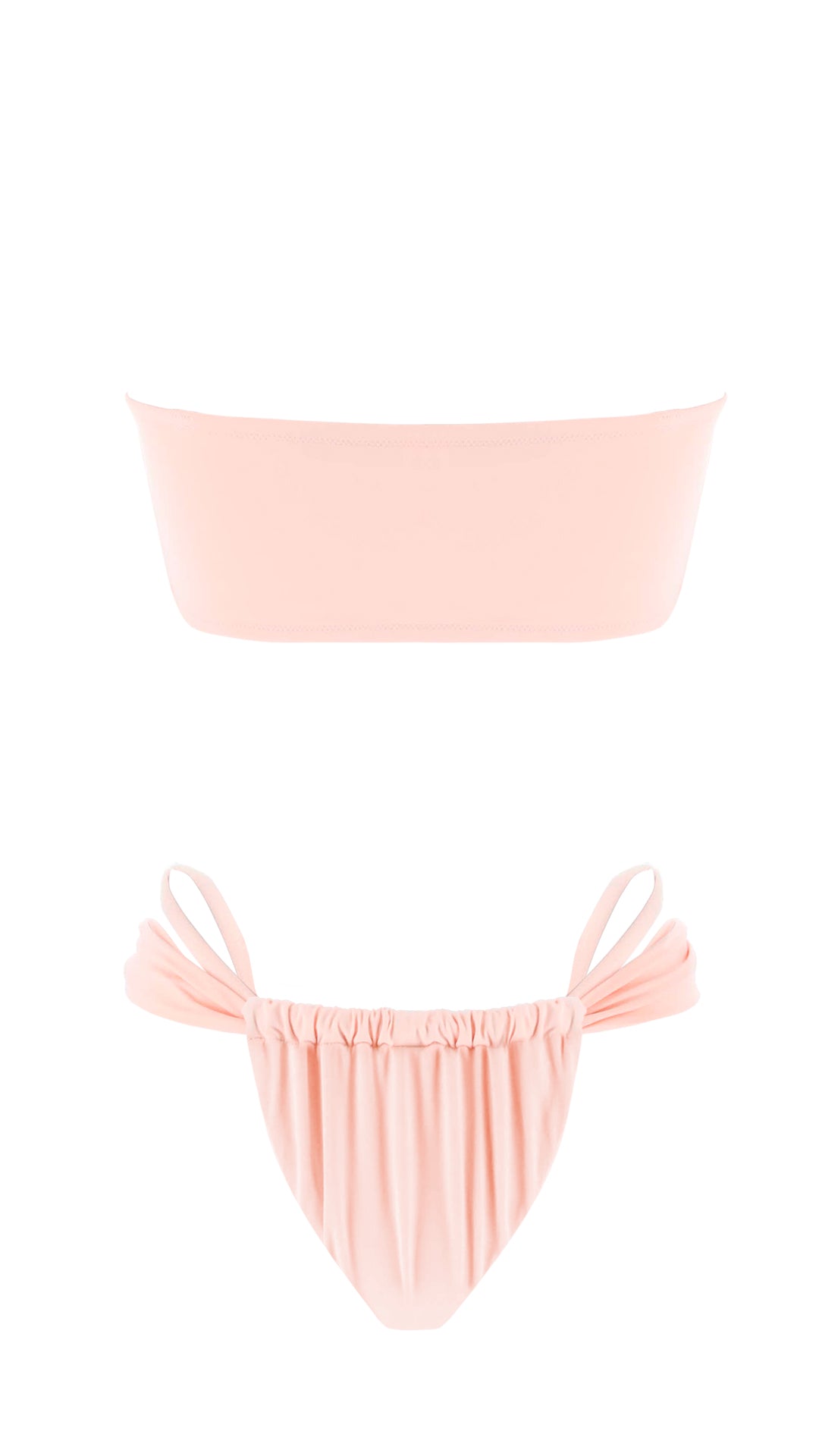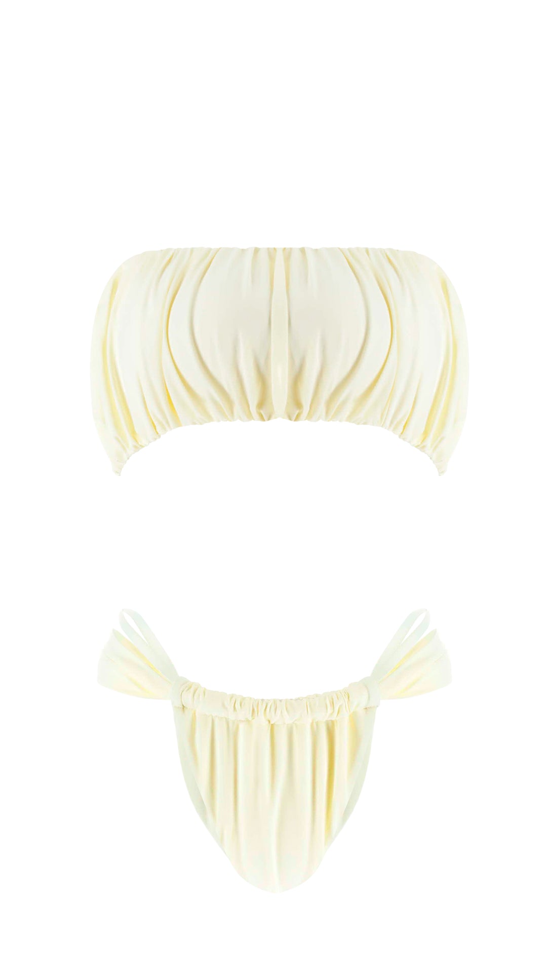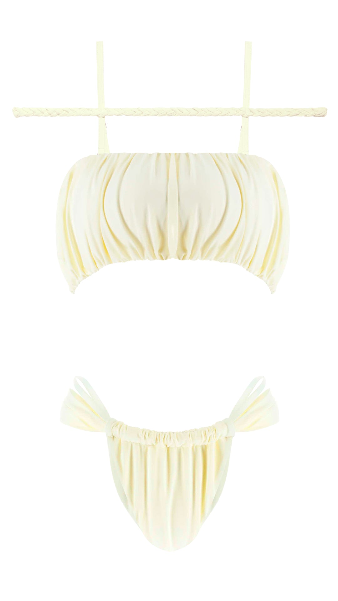伸縮性のあるストラップが特徴のGivernyの水着は、これまでにないデザインとなっています。肩のストラップは取り外し可能で、2WAY仕様として着用が可能。全体に施されたギャザーが女性らしさを引き立てるデザインです。