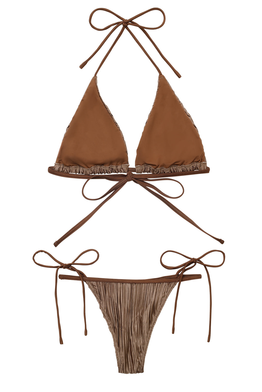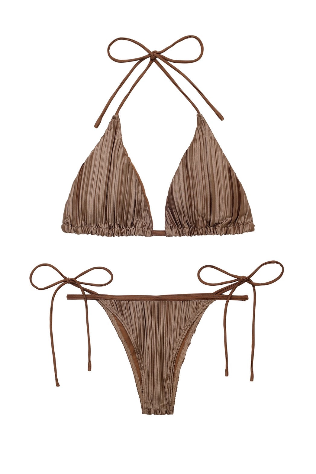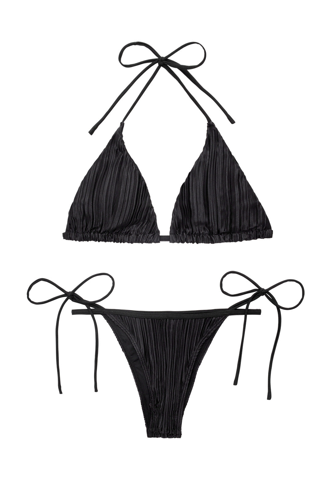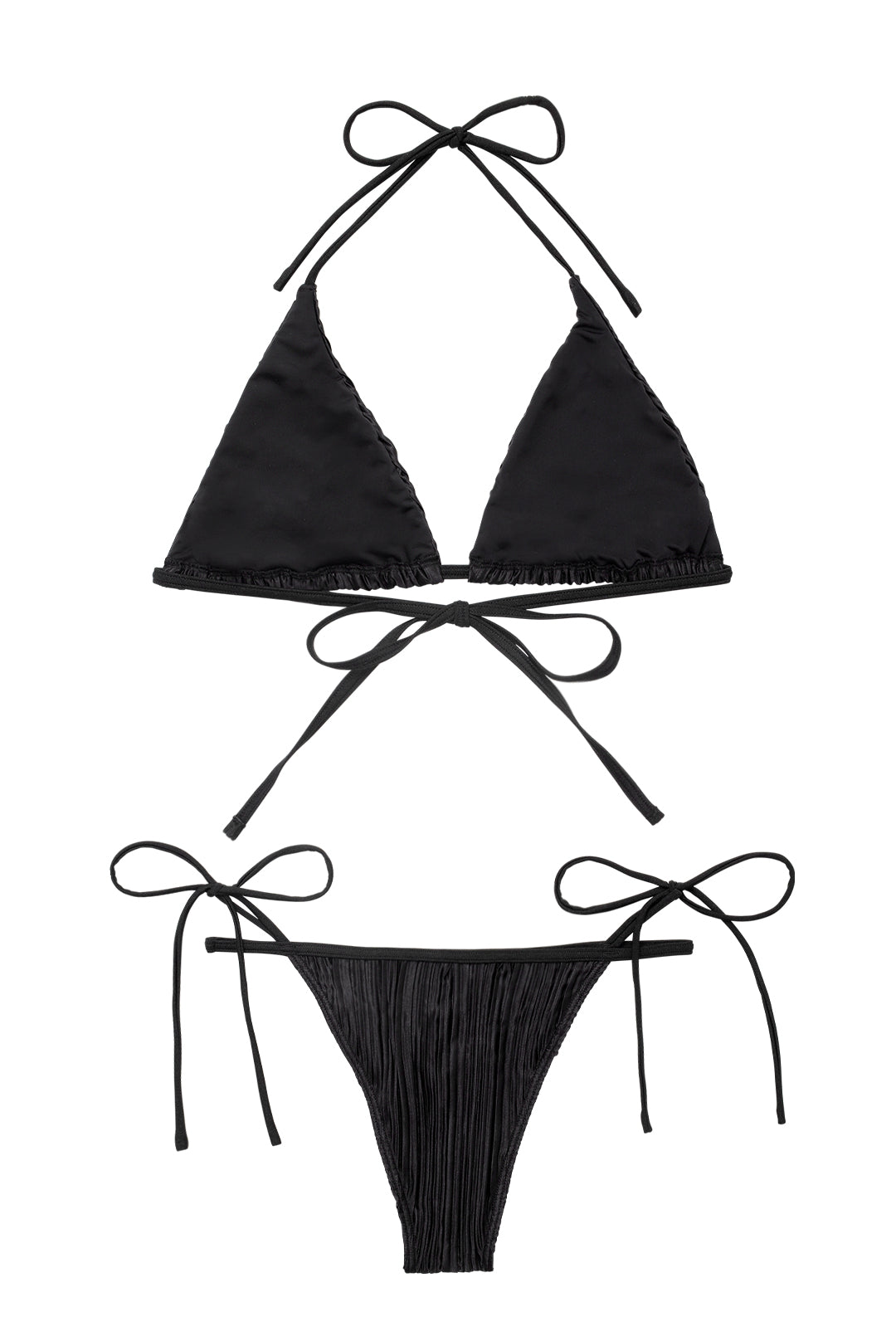 トップスは華奢なホルターネック仕様のトライアングルデザイン。細やかなプリーツがバストに自然な立体感を生み出し、シンプルでありながら存在感のある印象に仕上げています。